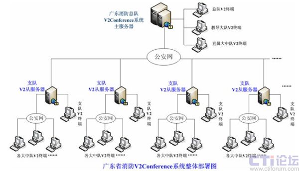 整體系統(tǒng)采用服務(wù)器級聯(lián)架構(gòu)部署,在總隊網(wǎng)絡(luò)中心部署了主服務(wù)器,全省各地市21個支隊,每個支隊部署1臺v2從服務(wù)器,與總隊主服務(wù)器進(jìn)行級聯(lián),所有從服務(wù)器下面每個大、中隊分別作為一個終端節(jié)點接入支隊從服務(wù)器,教導(dǎo)大隊及總隊直屬特勤大隊直接接入總隊服務(wù)器,所用傳輸線路為總隊現(xiàn)有的公安網(wǎng)絡(luò)資源。通過目前整個v2系統(tǒng)的部署完成了廣東消防全省300多點終端會場的同時接入,在這個遠(yuǎn)程教育系統(tǒng)平臺之上,可以同時召開總隊對支隊的會議,支隊對所屬大中隊的會議,多點即時交流會議,會議和會議之間互不影響,獨立開展。在大數(shù)量終端同時參與同一會議時,V2conference系統(tǒng)的級聯(lián)功能可以有效地將服務(wù)器資源進(jìn)行整合,以適應(yīng)更大規(guī)模的會議應(yīng)用,并通過多服務(wù)器來均衡整體系統(tǒng)壓力,使系統(tǒng)更加穩(wěn)定。