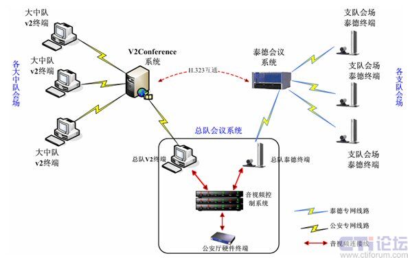 另外在廣東省消防信息系統(tǒng)內(nèi),現(xiàn)有硬件泰德電視電話會議系統(tǒng)共有23個終端節(jié)點,主要基于獨立的IP專用網(wǎng)絡(luò),并與V2conference系統(tǒng)所在IP網(wǎng)絡(luò)相互獨立。為了達(dá)到和硬件系統(tǒng)共用互通,實現(xiàn)全網(wǎng)會議互通,在總隊會議系統(tǒng)中,將會議系統(tǒng)一級網(wǎng)(省公安廳——消防總隊)、二級網(wǎng)(消防總隊——支隊)、三級網(wǎng)(消防支隊——消防大中隊)通過消防總隊會議控制系統(tǒng)和v2conference系統(tǒng)自帶的H.323互通功能模塊融合到一起。