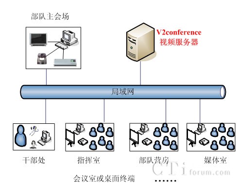 V2視頻會議系統(tǒng)建立在森警部隊專網(wǎng)的基礎上,各區(qū)作戰(zhàn)部隊會議室、指揮室和部隊營房會議均為光纖100M接入,每個中隊官兵營房都集中建立了培訓會議室,負責日常新兵的培訓教育。在現(xiàn)有的網(wǎng)絡基礎上構(gòu)建了V2視頻會議系統(tǒng),來滿足各個中隊和教導大隊的網(wǎng)絡會議和培訓需求。在每個節(jié)點會議室部署了電視、攝像頭和相關(guān)音響設備,目前已經(jīng)建成10多個網(wǎng)絡會議節(jié)點的遠程視頻培訓系統(tǒng)。