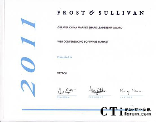 CTI論壇(ctiforum)1月12日消息(記者 浩宇):全球領(lǐng)先的Web會(huì)議解決方案供應(yīng)商V2威速宣布,榮獲全球領(lǐng)先咨詢公司Frost&Sullivan頒發(fā)的“大中華區(qū)Web軟件會(huì)議市場(chǎng)份額領(lǐng)導(dǎo)者”殊榮。Frost & Sullivan設(shè)立該獎(jiǎng)項(xiàng)旨在表彰各個(gè)行業(yè)領(lǐng)域在過去一年業(yè)績表現(xiàn)最佳并占有最高市場(chǎng)份額的企業(yè)。