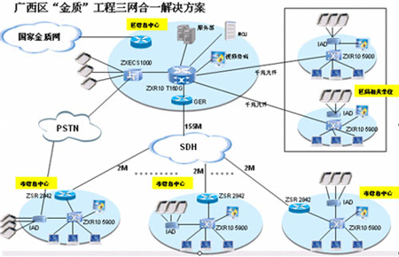 憑借全面的融合通信產(chǎn)品和解決方案、豐富的電子政務(wù)工程建設(shè)和實(shí)施經(jīng)驗(yàn),中興通訊為廣西“金質(zhì)工程”(一期)系統(tǒng)“量身定做”出一整套基于IP融合、使用方便靈活的解決方案:將整個系統(tǒng)分為兩個部分,即區(qū)質(zhì)監(jiān)局一級節(jié)點(diǎn)信息中心、各地市質(zhì)監(jiān)局及相關(guān)研究機(jī)構(gòu)共計(jì)15個二級節(jié)點(diǎn)信息中心,在管理上體現(xiàn)垂直的系統(tǒng)架構(gòu)。整個網(wǎng)絡(luò)可以看作一個分級的星形網(wǎng)絡(luò),結(jié)構(gòu)簡單、易于擴(kuò)展。