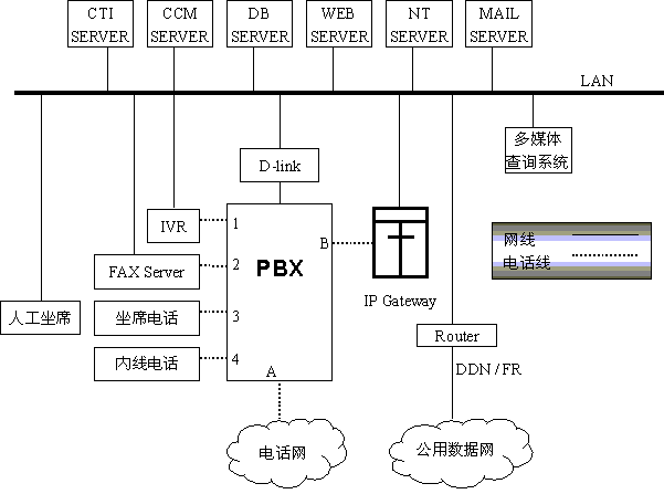 上圖所示的分布于不同地區(qū)的多個系統(tǒng)可以互相聯(lián)接,構(gòu)成分布式客戶服務(wù)中心,如地市話務(wù)員回答不了客戶的問題,可轉(zhuǎn)接到省中心,話務(wù)員在坐席上操作請求CCM轉(zhuǎn)接省中心,CCM通過CTI SERVER控制PBX將A與B接通,IP網(wǎng)關(guān)響應(yīng)呼叫,將電話號碼信號翻譯成相關(guān)的IP地址,將線路上的語音信號處理成數(shù)據(jù)信息并打包,通過本地LAN、本地ROTUER、公用數(shù)據(jù)網(wǎng)、省中心LAN等發(fā)送到省中心的IP網(wǎng)關(guān)、呼叫到達省中心PBX的B,按省中心系統(tǒng)的排隊和選擇坐席的規(guī)則選擇坐席,省中心的IP網(wǎng)關(guān)將接收到的數(shù)據(jù)解包還原成語音信號通過B送坐席電話3,雙方通話。這樣全省各市縣將聯(lián)結(jié)成一個大的分布式呼叫中心,同時IP電話也可用于企業(yè)內(nèi)部通信,通信費將降至原來的一半以下。