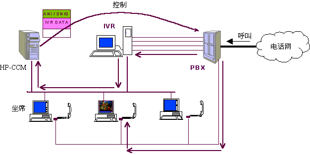 在任何一個步驟中,如客戶選擇了人工坐席,則IVR請求CCM根據(jù)多種情況選擇一個空閑坐席(選擇方法見下文)并控制PBX將呼叫與選擇的人工坐席接通,同時系統(tǒng)在客戶對IVR操作的過程中,已經(jīng)幀測到了客戶所使用的電話號碼、客戶的按鍵信息,系統(tǒng)還記錄有客戶上次的呼叫情況等數(shù)據(jù),這些數(shù)據(jù)基本上可以確定客戶大體關(guān)心的問題,對于老客戶甚至可以初步認定呼叫者的身份、年齡、性別、業(yè)務(wù)辦理情況等,因此,話務(wù)員在與客戶談話之前就已經(jīng)了解了相當多的信息,并控制選定的坐席屏幕顯示有關(guān)客戶信息,便于直接進入正題,提高了效率?蛻襞c坐席的交流過程中,坐席可通過終端請求CCM控制PBX將本次呼叫與其他話務(wù)員(坐席)、專家或業(yè)務(wù)辦公室(如內(nèi)線電話)等接通,當坐席人員將呼叫轉(zhuǎn)移到另一坐席或?qū)<視r,系統(tǒng)將在本呼叫中收集的各類數(shù)據(jù)同時轉(zhuǎn)向下一坐席電腦。在坐席人員解答客戶問題時,可將問題及解答情況收集,便于分析坐席人員的業(yè)務(wù)素質(zhì)和問題傾向,從而有針對性地培訓坐席人員。對于客戶來講,他可以通過電話按鍵在話務(wù)員、自動語音、傳真、專家和業(yè)務(wù)辦公室之間漫游,系統(tǒng)將記錄客戶漫游的路徑,對于設(shè)計較好的菜單和路經(jīng)來說,客戶的漫游路徑基本上可以反映出其需求,大量客戶的漫游路徑無疑將反映出市場需求。