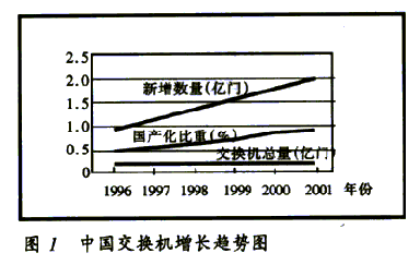 2000年,中國(guó)公用通信網(wǎng)上局用程控交換機(jī)的總?cè)萘窟_(dá)到1.79億門,國(guó)內(nèi)生產(chǎn)設(shè)備的比重達(dá)80%。預(yù)計(jì)2001年新增交換機(jī)容量2100萬(wàn)門,總?cè)萘窟_(dá)到2億門,國(guó)內(nèi)生產(chǎn)設(shè)備的比重超過85%,增長(zhǎng)趨勢(shì)見圖1。