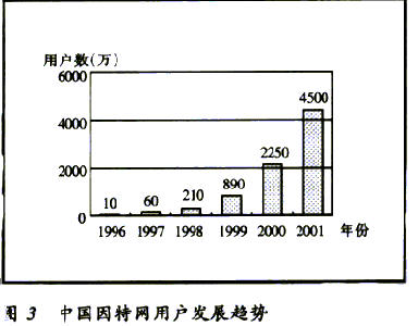據(jù)CNNIC統(tǒng)計(jì)的數(shù)據(jù)表明,到2000年12月31日止,中國(guó)的因特網(wǎng)用戶達(dá)到2250萬(wàn)戶,上網(wǎng)計(jì)算機(jī)892萬(wàn)臺(tái),預(yù)計(jì)2001年中國(guó)將有超過4500萬(wàn)的網(wǎng)民。中國(guó)域名總數(shù)為12.2萬(wàn)個(gè),WWW站點(diǎn)數(shù)26.54萬(wàn)個(gè)。中國(guó)因特網(wǎng)的發(fā)展速度驚人,與國(guó)際因特網(wǎng)的發(fā)展速度相當(dāng)。中國(guó)因特網(wǎng)用戶發(fā)展趨勢(shì)見圖3。
