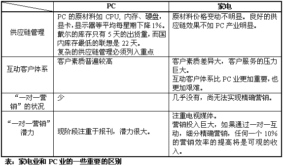 聯(lián)想長期構(gòu)筑的、在中國PC制造業(yè)的核心競爭力,正受到戴爾的巨大威脅,導(dǎo)致聯(lián)想開始轉(zhuǎn)而采用戴爾的按客戶需求定制、直接銷售的模式,希望建立新的核心競爭力,再度引領(lǐng)中國PC產(chǎn)業(yè)。IT制造業(yè)的巨變,戴爾的成功給陷于低層次競爭的家電產(chǎn)業(yè)很大的啟發(fā),曾經(jīng)鑄造中國家電企業(yè)輝煌的核心競爭力急需注入新的生命力,以適應(yīng)新的競爭形勢。計算機(jī)技術(shù)、互動通信技術(shù)的進(jìn)步以及互聯(lián)網(wǎng)的出現(xiàn)使企業(yè)能夠建立與用戶之間一對一的密切客戶關(guān)系,使服務(wù)創(chuàng)造價值,IT技術(shù)推動技術(shù)、產(chǎn)品、生產(chǎn)、銷售和營銷的發(fā)展,支撐家電企業(yè)建立新的核心競爭力。在同質(zhì)化競爭的環(huán)境下,家電企業(yè)也許更應(yīng)該從服務(wù)、營銷、銷售方面來建立自己的核心競爭力。海爾就是典型的例子,海爾的發(fā)展與它完善的服務(wù)體系和服務(wù)制度是分不開的。聚焦于服務(wù)、營銷、銷售的客戶關(guān)系管理(CRM)系統(tǒng)讓家電企業(yè)看到了新的希望?梢灶A(yù)言,CRM將為家電業(yè)點燃一盞新啟航燈。