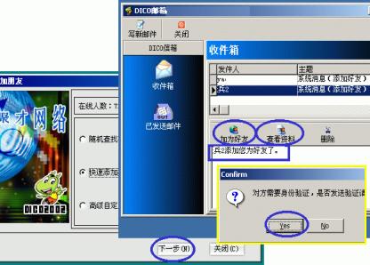3、點按主窗口下方的"覓友"按鈕,彈出的對話框中選擇三種添加方式之一后按"下一步"進行好友的添加;當有人加你為好友時,系統會有提示音閃并DICO圖標在任務欄不斷閃爍,你點擊上來后會彈出你的DICO郵箱對話框并收到有某某加你為好友的消息,此時可先點按"查看資料"了解一下來人相關信息;若有意可點按"加產好友"加來訪者為好友(下圖7)。