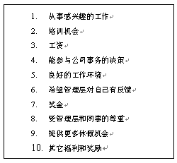 10. 來(lái)自公司高層的認(rèn)可。這是一個(gè)非常有效的作法,能得到公司高層的認(rèn)可對(duì)很多人來(lái)說(shuō),是一生都可以值得回憶的事情。如果在一家全球的大公司,和公司CEO共同進(jìn)餐,得到公司CEO的親筆信,和CEO合影等都是非常高的榮譽(yù)。當(dāng)然,這個(gè)作法不是可以經(jīng)常用的。因?yàn),如果用得太?jīng)常了,就可以失去了一種"神秘感"或"來(lái)之不易"的感覺。