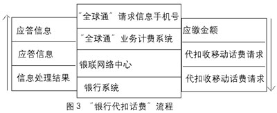 “銀行代扣話費(fèi)”方式 對(duì)于“由非銀行端發(fā)起,但需銀行代扣收的交易”,其執(zhí)行通過(guò)多種接入方式(如手機(jī)短消息、GPRS、客戶服務(wù)中心、自助終端、因特網(wǎng)等)提交信息,內(nèi)容包括“全球通”手機(jī)號(hào)、“神州行”手機(jī)號(hào)、IP電話卡號(hào)、付費(fèi)金額、銀行賬戶、密碼、交易類型等。