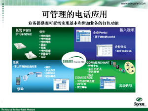Sonus IP CENTREX解決方案主要基于可管理的語音數(shù)據(jù)綜合寬帶接入網(wǎng);能夠提供話音業(yè)務(wù)的應(yīng)用交換機;能夠提供桌面話音業(yè)務(wù)的IP