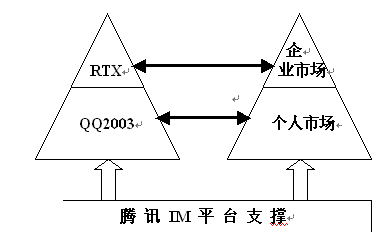 1、從QQ2003到RTX是對IM市場的全方位介入。騰訊推出革命性的QQ2003,緊接著又啟動RTX新品牌進(jìn)軍企業(yè)市場,標(biāo)志著其不滿足于將自身定位為娛樂及時(shí)信息平臺和服務(wù)提供商,而是對商務(wù)市場和個(gè)人市場進(jìn)行理性細(xì)分后的一種戰(zhàn)略決策,向兩類不同的用戶推出不同的品牌,提供不同的服務(wù)(如下圖),既保證了不同用戶的需求特質(zhì),又有效避免了品牌混亂。