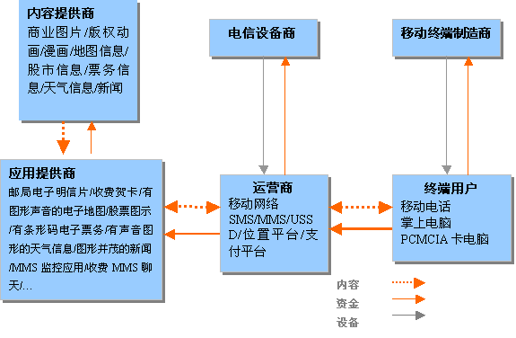 MMS業(yè)務產業(yè)價值鏈的主要環(huán)節(jié)包括網絡運營商,終端,應用提供商,內容提供商等,各環(huán)節(jié)的狀況直接影響著MMS業(yè)務的發(fā)展狀況與市場前景。