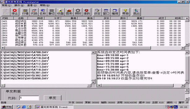 行情也可以單發(fā),只要在進(jìn)行證券信息發(fā)布時(shí)在程序主界面的下方<單發(fā)數(shù)據(jù)>區(qū)輸入要單發(fā)的股票代碼,然后點(diǎn)擊<單發(fā)>按鈕,系統(tǒng)就會(huì)盡快刷新該只股票。