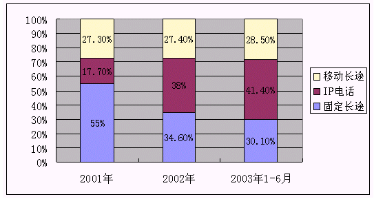 從圖上看,移動長途占整個長途通話比重增長緩慢,IP長途所占比重上升較快,已由2001、2002年的17.7%、38%上升到41.4%,與此相反,傳統(tǒng)固定長途所占比重下降較快,由2001年占整個長途通話的55%,迅速下降到目前的30.1%。隨著移動長途、IP長話的異質競爭加劇,大量分流了傳統(tǒng)固定長途,2003年1-6月傳統(tǒng)固定長途中國內長途、國際及港澳臺通話時長比上年同期分別下降0.6%、6.4%、13.9%。