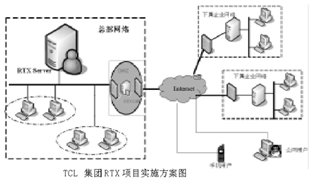在RTX項(xiàng)目的實(shí)施上,TCL集團(tuán)公司專門購置了一臺P4 2.4G,256M,40G的高配置服務(wù)器作為RTX Server(如圖),安裝在集團(tuán)公司的總部網(wǎng)絡(luò)上,同時(shí)連接到集團(tuán)公司的專線上,并分配外部IP地址,供異地員工登陸到服務(wù)器。整個(gè)RTX實(shí)施方案如圖1所示:在硬件方面,只添加一臺RTX Server作為IM服務(wù)器,無需對現(xiàn)有網(wǎng)絡(luò)作大規(guī)模改動(dòng);在軟件方面,在RTX Server上安裝最新的服務(wù)器端軟件RTX 3.2版本,使用RTX的集團(tuán)員工自行下載安裝RTX客戶端,客戶端能傻瓜式在線更新。