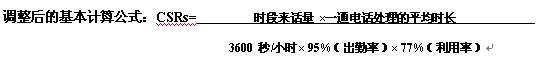對(duì)于任何呼叫中心,由于培訓(xùn)、會(huì)議、休息等原因,客戶服務(wù)代表不可能用全部出勤的時(shí)間來(lái)接聽電話,客戶服務(wù)代表的利用率不可能達(dá)到100%,因此,依據(jù)客服中心的行業(yè)標(biāo)準(zhǔn),考慮出勤率和人員利用率;經(jīng)過(guò)調(diào)整后計(jì)算公式如下: