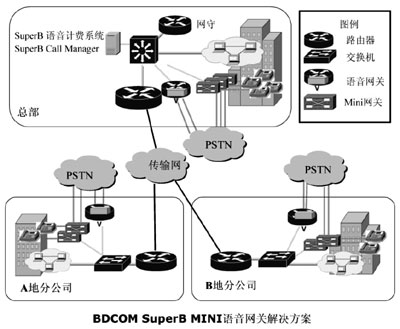 根據(jù)西北石油公司各地分公司電話全部是PSTN直線電話,沒有單位內(nèi)部的PBX,不能通過語音網(wǎng)關(guān)把這些直線電話統(tǒng)一接入到IP網(wǎng)絡(luò)上這一實(shí)際情況,方案提供方博達(dá)公司提供了一款小型BDCOM SuperB Mini語音網(wǎng)關(guān),來解決PSTN程控電話統(tǒng)一接入IP語音網(wǎng)絡(luò)的問題。使用BDCOM SuperB Mini并結(jié)合西北石油公司組建的企業(yè)內(nèi)部VoIP網(wǎng)絡(luò),克服了傳統(tǒng)語音網(wǎng)關(guān)解決方案的不足和缺點(diǎn)。