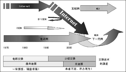 傳統(tǒng)電信網(wǎng)和互聯(lián)網(wǎng)都面臨著挑戰(zhàn),基于電話業(yè)務(wù)設(shè)計的電路交換網(wǎng)不能靈活適應(yīng)帶寬各異的數(shù)據(jù)業(yè)務(wù)的發(fā)展。專為數(shù)據(jù)業(yè)務(wù)設(shè)計的互聯(lián)網(wǎng)則存在著安全性、可管理性、商業(yè)模式等問題的困擾。NGI對目前電信網(wǎng)的主要盈利業(yè)務(wù)語音的質(zhì)量保證以及對電信網(wǎng)增長空間很大的業(yè)務(wù)(移動)關(guān)注不夠。NGI可能達到的目標(biāo)不能滿足電信界的需要。因此,在NGI之后ITU和ETSI等提出了更高的目標(biāo)——NGN,這就是NGN的提出背景。信息產(chǎn)業(yè)部電信研究院科技委副主任委員雷震洲認(rèn)為,兩大亮點點燃了NGN:一是數(shù)據(jù)超過語音的信息需求,全球互聯(lián)網(wǎng)用戶目前已逾7億,全世界在網(wǎng)上傳送的以IP為代表的數(shù)據(jù)業(yè)務(wù)量已經(jīng)超過語音業(yè)務(wù)量;二是移動超過固定的個性化需求,全球移動用戶已經(jīng)超過13億,近100個國家的移動用戶數(shù)已經(jīng)超過固定用戶數(shù),我國在2003年10月移動用戶也超過了固定用戶數(shù)。