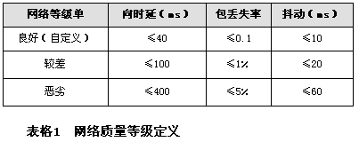 描述承載網(wǎng)性能指標(biāo)的參數(shù)主要有帶寬、時(shí)延、時(shí)延抖動(dòng)、丟包率等,其中帶寬是一個(gè)基本要求,必須滿足規(guī)劃的帶寬要求。根據(jù)通信行業(yè)標(biāo)準(zhǔn)YD/T1071-2000《IP電話網(wǎng)關(guān)設(shè)備技術(shù)要求》,網(wǎng)絡(luò)質(zhì)量可以分為以下三級: