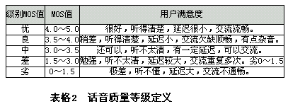 對于IP電話質(zhì)量的評價(jià)采用MOS(主觀平均評分)值評價(jià),評測方法在ITU-TP.800中定義。實(shí)際中可以采用PESQ(語音質(zhì)量的知覺評估)客觀測試方法,在ITU-TP.862(PESQ)中定義。MOS值的定義如下表所示: