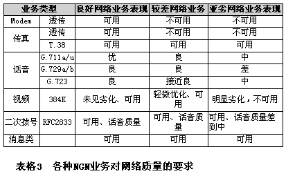 經(jīng)過試驗(yàn)測試,對不同網(wǎng)絡(luò)質(zhì)量下的NGN業(yè)務(wù)表現(xiàn)總結(jié)如下表所示: