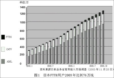 從現(xiàn)狀看,在亞洲發(fā)展FTTH比較迅速的是日本和韓國(guó),早在20世紀(jì)90年代初期日本就制定了雄心勃勃的計(jì)劃:2010年使光纖進(jìn)入全國(guó)家庭。2001年以來(lái),日本FTTH市場(chǎng)進(jìn)入快速增長(zhǎng)階段:2001年只有usen和NTT東日本、NTT西日本幾家公司,而到2002年7月,已經(jīng)有9家公司提供FTTH業(yè)務(wù)。據(jù)日本總務(wù)省統(tǒng)計(jì),到2004年7月,日本FTTH用戶數(shù)已經(jīng)突破130萬(wàn),預(yù)計(jì)在2005年達(dá)到450萬(wàn)。