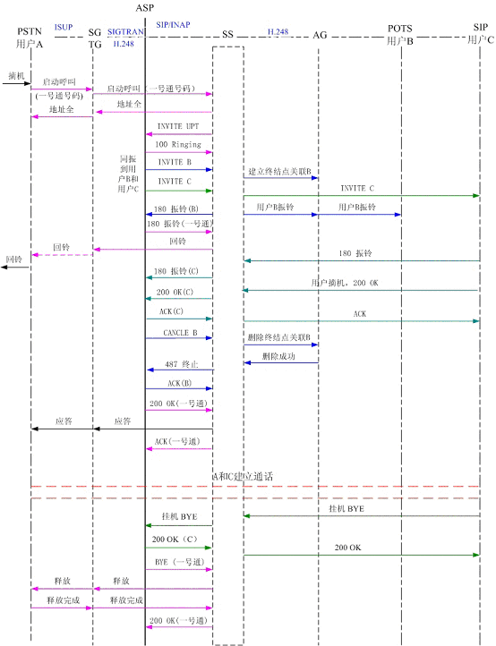 圖4為PSTN用戶A撥打一號通用戶,同振到軟交換域AG下POTS用戶B和SIP用戶C,其中軟交換和應(yīng)用服務(wù)器以SIP協(xié)議相連,軟交換和AG、軟交換和TG以H.248協(xié)議相連?梢钥吹剑脩鬊和用戶C同時振鈴,用戶C摘機應(yīng)答,應(yīng)用服務(wù)器取消了對用戶B的振鈴。雙方通話,通話結(jié)束,用戶C掛機,系統(tǒng)釋放了連接。