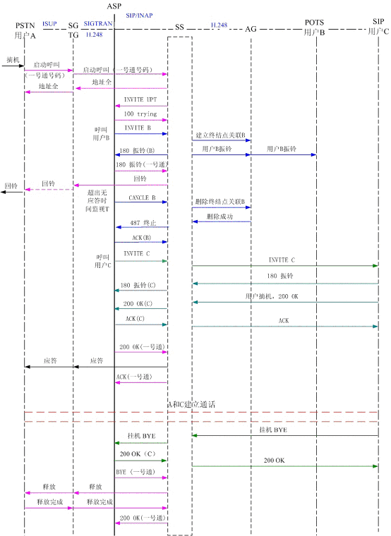 圖5為PSTN用戶A撥打一號通用戶,順呼軟交換域AG下POTS用戶B和SIP用戶C,其中軟交換和應(yīng)用服務(wù)器以SIP協(xié)議相連,軟交換和AG、軟交換和TG以H.248協(xié)議相連?梢钥吹,用戶B首先振鈴,振鈴達到規(guī)定時間后,應(yīng)用服務(wù)器取消了對用戶B的振鈴,轉(zhuǎn)而對用戶C振鈴。用戶C摘機應(yīng)答,通話結(jié)束,用戶C掛機,系統(tǒng)釋放了呼叫。