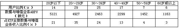 與競(jìng)爭(zhēng)對(duì)手SKT一樣,KTF針對(duì)不同年齡段的用戶建立了個(gè)性化的獨(dú)立服務(wù)品牌,這些服務(wù)品牌分別是BiGi(主要針對(duì)13~18歲的未成年人)、Na(主要針對(duì)18~25歲的青年學(xué)生)、Main(針對(duì)25~35歲的男性用戶)、Hyo(針對(duì)35歲以上用戶)以及DRAMA(針對(duì)所有年齡的女性用戶)。從各年齡用戶群的業(yè)務(wù)使用情況看,占總用戶43%的30歲以下年輕用戶是KTF最主要的數(shù)據(jù)與增值業(yè)務(wù)消費(fèi)群體。見表4。