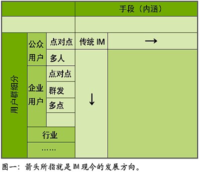 IT行業(yè)發(fā)展數十年,有一個共識,或是一種經驗結論,大約是:在用“老工具解決新問題”、“老工具解決老問題”、“新工具解決老問題”、“新工具解決新問題”四者中,一般最先者最善,也極討巧,最后者則最為事倍功半。觀IM發(fā)展趨勢,似乎介于“新工具解決老問題”、“新工具解決新問題”二者之間,就體現(xiàn)在表中兩個箭頭上,是以錢景堪憂。