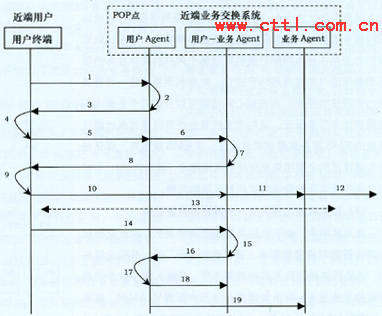 在POP點處,每類業(yè)務(wù)有一個“業(yè)務(wù)Agent”,其生命周期與運營商此類業(yè)務(wù)的生命周期相同,即從運營商開通此類業(yè)務(wù)到運營商終止提供此類業(yè)務(wù)為止,因此“業(yè)務(wù)Agent”基本上是長期存在的。“業(yè)務(wù)Agent”負(fù)責(zé)對不同用戶的同類業(yè)務(wù)進(jìn)行匯聚,統(tǒng)一與遠(yuǎn)端的“業(yè)務(wù)Agent”進(jìn)行業(yè)務(wù)交互。