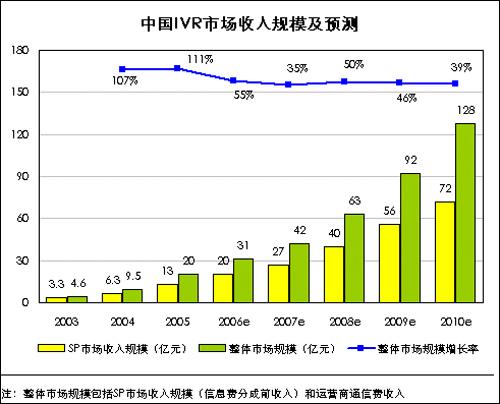 iResearch通過研究分析,2005年中國IVR市場總體收入規(guī)模(包括通信費(fèi)及信息費(fèi))為20億元,2006年將達(dá)到31億元,預(yù)計(jì)到2010年將達(dá)到128億元,市場增長率將呈現(xiàn)逐步下降的趨勢(shì)。其中IVR市場中SP的收入規(guī)模在2005年為13億元,2006年將達(dá)到20億元。