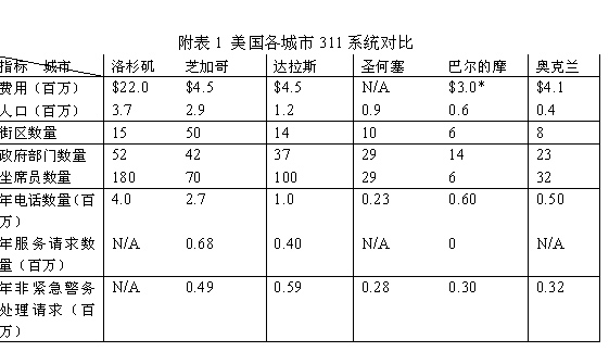 附表1 美國各城市311系統(tǒng)對比