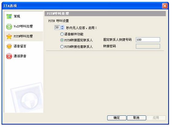 如果你使用的電話交換機比較簡單,沒有內置有語音引導號碼,你可以使用 ITA的轉接任意電話功能來實現(xiàn),設置0秒啟動,將轉接密碼置為空,配置如下: