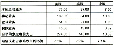 2005年美國、英國和中國電信消費支出構(gòu)成比例分析(單位:美元)