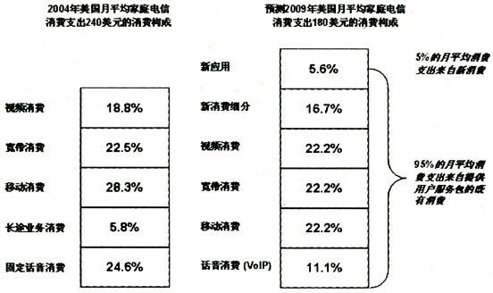 作為可以提供整合平臺的服務(wù),IMS在消費者和企業(yè)應(yīng)用上都會為運營商帶來收入的增長。首先分析IMS可能為消費者帶來的收入增長。比較美國2004年和2009年預(yù)計的電信消費支出構(gòu)成。2009年,95%的消費支出仍然是既有的業(yè)務(wù),運營商通過提供業(yè)務(wù)包和服務(wù)包捆綁既有用戶群。5%的新消費支出是IMS新應(yīng)用的主戰(zhàn)場。