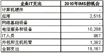 2010年預(yù)計IMS應(yīng)用在企業(yè)中的收入機(jī)會(單位:百萬美元)