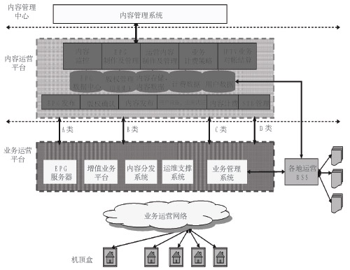 IPTV業(yè)務對系統(tǒng)運行、管理、網(wǎng)絡的要求都非常高,因而必須采用分布式結構來進行部署。從部署層次來分,可分為內容管理中心、內容集成運營平臺、業(yè)務支撐平臺。