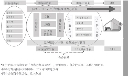 IPTV內容集成運營商,電信運營商提供寬帶網(wǎng)絡及IPTV系統(tǒng),雙方合作提供業(yè)務的業(yè)務模式。這一模式一方面可以發(fā)揮廣電在內容監(jiān)管、內容運營方面的優(yōu)勢,另一方面可以延續(xù)電信在互聯(lián)網(wǎng)運營和維護上的優(yōu)勢。雙方之間的合作是資源與資源的對接,優(yōu)勢與優(yōu)勢的合作,各用所長,共同推進,利益共享。