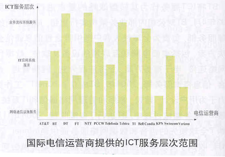 ICT服務(wù)的范圍大致可分為三個(gè)層次,一是面向網(wǎng)絡(luò)通信設(shè)施(包括網(wǎng)絡(luò)規(guī)劃、網(wǎng)絡(luò)系統(tǒng)集成、外包管理等)的服務(wù),二是面向IT應(yīng)用系統(tǒng)(包括軟件系統(tǒng)支持與維護(hù)、系統(tǒng)集成、應(yīng)用托管等)的服務(wù),三是面向業(yè)務(wù)流程系統(tǒng)(包括系統(tǒng)咨詢、業(yè)務(wù)流程外包等)的服務(wù)。從客戶視角來看,第三種服務(wù)的層次最高,第一種服務(wù)的層次最低,而電信運(yùn)營商提供的ICT服務(wù)層次越高,則表明其在該領(lǐng)域拓展的范圍越廣。上述國際電信運(yùn)營商提供的ICT服務(wù)層次范圍如下圖所示。