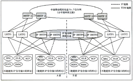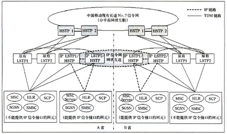 該種方案情況下,省內(nèi)支持IP信令的網(wǎng)元直接與IP LSTP相連(兩級(jí)組網(wǎng)情況下還需要通過TDM方式與現(xiàn)有HSTP相連),不支持IP信令的網(wǎng)元仍保持原有連接方式與現(xiàn)有LSTP相連(兩級(jí)組網(wǎng)情況下還要與HSTP)。省際信令消息仍由現(xiàn)有長(zhǎng)途No.7信令網(wǎng)疏通,省內(nèi)信令由LSTP疏通。