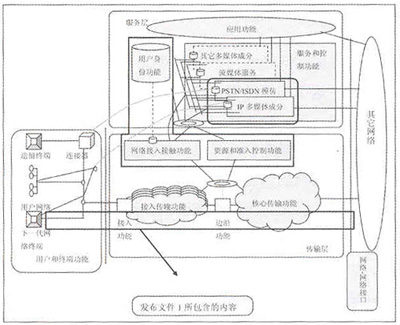 關于兩個層之間的連接,與承載者相關的事項是由資源和準入控制功能(RACFs)來提供;與用戶身份有關的事項則由網(wǎng)絡接入與接觸功能來完成。
