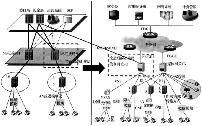 改造后的匯接局和端局之間通過(guò)ISUP中繼方式連接,接入網(wǎng)絡(luò)通過(guò)V5中繼接入。如果原有匯接局直接下掛部分用戶,這部分用戶可以采用中繼媒體網(wǎng)關(guān)下掛接入單元的方式接入。原有端局用戶的數(shù)據(jù)管理和業(yè)務(wù)提供統(tǒng)一由軟交換支持,端局用戶的業(yè)務(wù)觸發(fā)提升到匯接局,避免對(duì)端局的改造,同時(shí),用戶可以使用軟交換業(yè)務(wù)平臺(tái)提供的各類(lèi)智能業(yè)務(wù)和增值業(yè)務(wù)。匯接局網(wǎng)絡(luò)優(yōu)化后,原有端局無(wú)法提供的業(yè)務(wù)均可以由軟交換業(yè)務(wù)系統(tǒng)提供。
