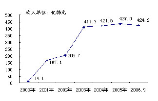 經(jīng)過6年多的運(yùn)營,韓國電信的eBilling業(yè)務(wù)發(fā)展良好,目前與其合作的ICP已達(dá)到500多家,內(nèi)容涵蓋了收費郵箱、在線軟件銷售、聊天、娛樂、游戲、漫畫、綜合信息等;業(yè)務(wù)收入也逐年上升,從2000年的14.1億韓元(折合人民幣0.11億元)增長到2006年9月份的424.2億韓元(折合人民幣3.3億元),如圖2、圖3所示。