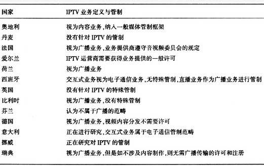 管制環(huán)境對IPTV的影響是根本性的。這種根本性主要體現(xiàn)在IPTV的準入和業(yè)務(wù)劃分上,前者決定電信公司是否能夠經(jīng)營IPTV,后者則決定IPTV應(yīng)如何管理。