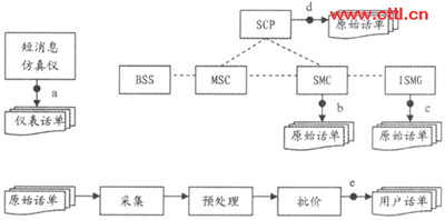 通過對移動點對點短消息計費原理的分析,可以把整個計費過程劃分為兩大環(huán)節(jié):計費點原始話單的生成和后期計費處理系統(tǒng)的處理。如果其中任何一個環(huán)節(jié)出現(xiàn)差錯都會降低用戶計費話單的準(zhǔn)確性。因此在測試過程中采取了用戶層面和設(shè)備層面相結(jié)合的方法:一方面使用仿真儀表大量模擬點對點短消息的發(fā)送和接收,得到用戶話單;一方面分析各個計費點生成的原始話單。