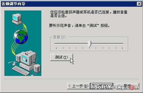 單擊“下一步”跳過Netmeeting服務(wù)器設(shè)置,此時向?qū)髮τ嬎銠C(jī)聲卡和麥克風(fēng)進(jìn)行測試,如圖5。