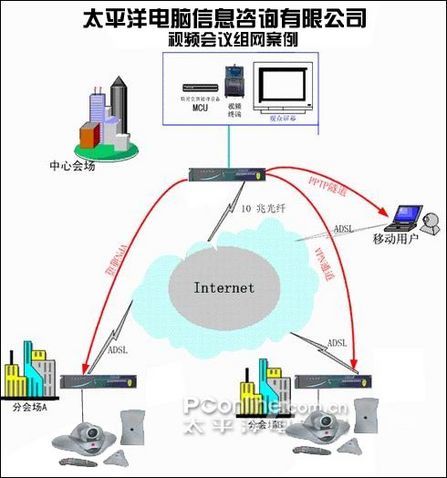 該方案有很強(qiáng)的針對性,作為主會場必須用10兆/20兆光纖接入INTERNET,且需要視頻交換處理設(shè)備MCU,而太平洋電腦網(wǎng)本身就具備雄厚的服務(wù)器作為基礎(chǔ)。廣州總公司還需要較高配置的視頻終端設(shè)備,在局域網(wǎng)網(wǎng)關(guān)上安裝較高配置路由器,主會場可以通過設(shè)置MCU隨時(shí)使某一分會場成為主席。