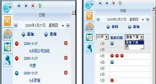 我們用過OUTLOOK的電子日程和手機(jī)自帶的日程功能都知道,電腦本機(jī)和手機(jī)實(shí)現(xiàn)日程管理都又各自很大的局限性,優(yōu)你客巧妙的實(shí)現(xiàn)了日程的網(wǎng)絡(luò)化管理并可以捆綁在手機(jī)提醒上,獨(dú)特又實(shí)用。其中紅綠日程各自代表工作和個(gè)人事務(wù),其中工作日程還能共享給上級。