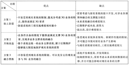 由于國內(nèi)電信運(yùn)營商一般已建有業(yè)務(wù)支撐系統(tǒng),因此在進(jìn)入到3G時(shí)代后就面臨著如何選擇3G融合計(jì)費(fèi)系統(tǒng)建設(shè)方式的問題。3G融合計(jì)費(fèi)系統(tǒng)的建設(shè)方案主要有獨(dú)立新建、升級改造、融合替換三種。三種不同的建設(shè)方案對比分析見表2。